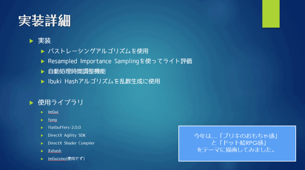 今年度は本当に時間がなかったので、比較的に誰にも分かる内容かつ知らない人には役立つ内容ということで,DXR 1.2の機能紹介をちらっとやりました。