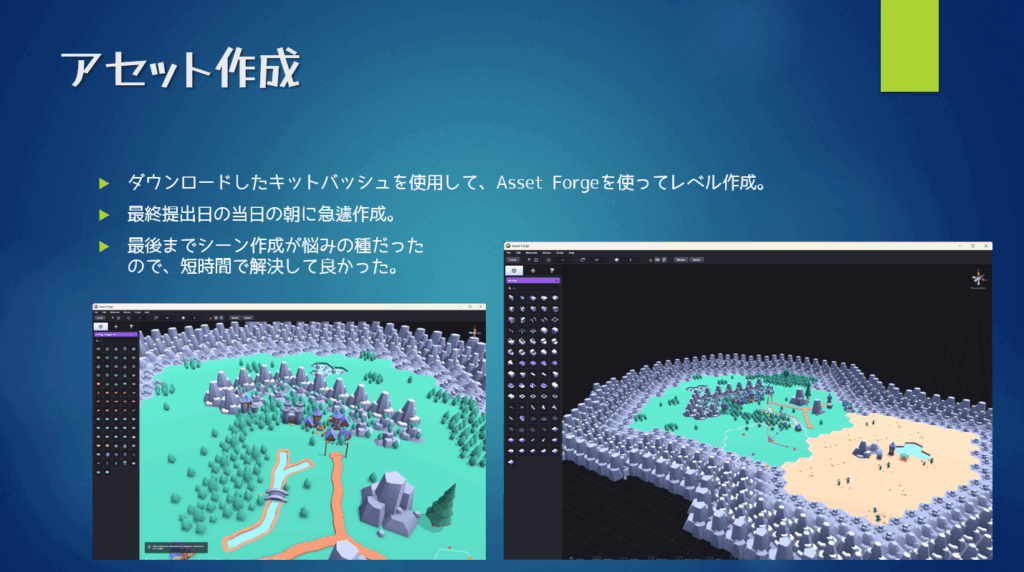 Asset Forgeを初めて使う状態でしたが,操作が簡単なので2時間ぐらいでレベルを作成しました。何とか間に合ってよかったです。お手軽にシーンが作成できるようになったので、来年も使おうかなとおもっています。おススメです。
