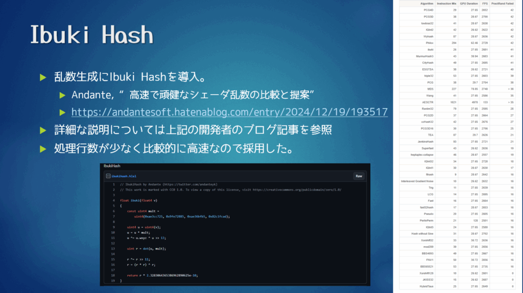 昨年までは乱数生成にPCGを使っていたのですが,今年はAndanteさんのブログで紹介されているIbuki Hashに変更してみました。サクッと差し替えできるのでお勧めです。