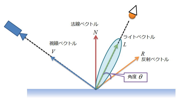フォンさんは何をやったかというと,視線が物体で跳ね返ったときの反射ベクトルRを求めて,反射ベクトルとライトベクトルLと近ければ強い光に,RとLが離れていれば弱い光になるように定式化したそうです。