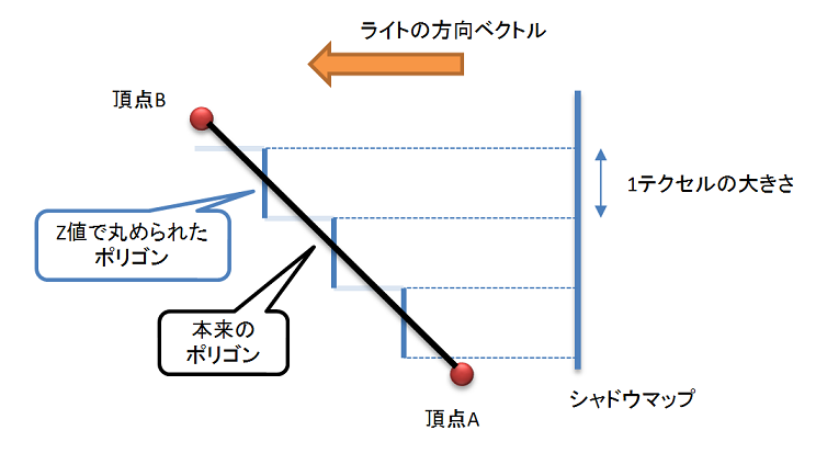 シャドウマップを使ってシャドウを付けるということはこの離散化されたポリゴンとの比較によって決定されます。つまり,下図のようになります。