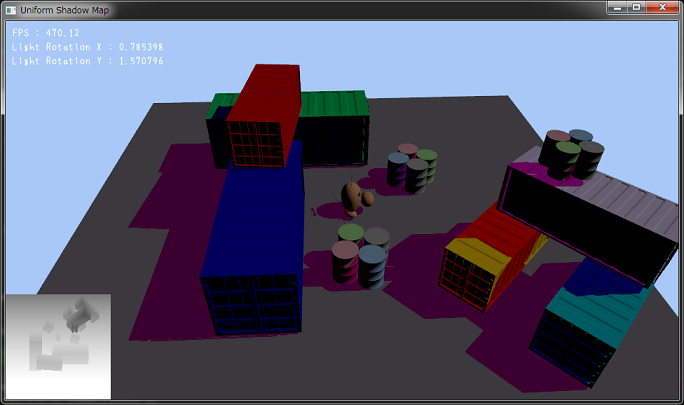 そのために,まずは深度値を格納するシャドウマップを作成する必要があります。これは単純にライト視点でシーンを描画すればよいです。