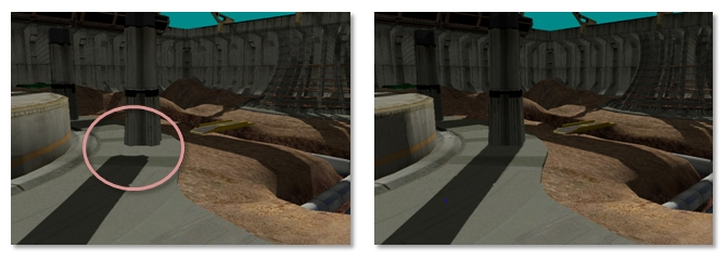 ただし、DepthBias と SlopeScaledDepthBias の使用によって、ポリゴンを極端な鋭角で表示すると、 バイアスの式によって非常に大きい z 値が生成されるという新たなレンダリングの問題が生じる可能性があります。 この結果、実質的に、シャドウ マップ内の元のサーフェスから極端に離れた位置にポリゴンが押し出されます。 この特有の問題を軽減するのに役立つ方法の 1 つとして、DepthBiasClamp を使用する方法があります。 これによって、計算される z バイアスの大きさに関する (正または負の) 上限が指定されます。確かに,極端に勾配が強い所があると異常にポリゴンが押し出されてしまう可能性があるので,これは良くない気がします。