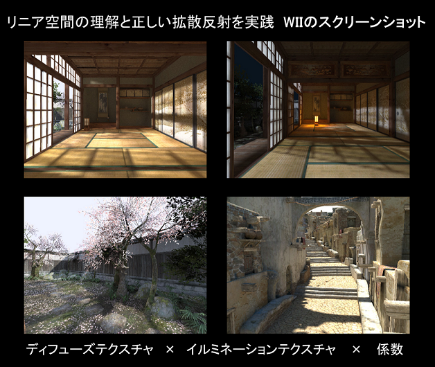 上図は今より5年の前のスライドの図で,さらに描画しているハードウェアはWiiです。Wii Uではありません。Wiiなので,左上の和室の画像の障子から左側に見える木などを見ると結構チープな感じがしますし, 右上の和室の図のシャドウマップを見るとかなりジャギーが気になります。しかし,ライティングに関してはどうでしょうか?少なくともWiiで描画している割にはかなり綺麗に見えますし,5年たった今でもさすがにプロがつくったなって感じがします。