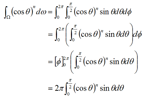 まず,積分式を計算していきます。普通は0~2πと0~πで積分するのですが,今回のPhongのBRDFは(cosθ)のn乗で,cosθのθの値は(π/2)を超えると,マイナスの値になってしまうので,ライティングには影響がありません。