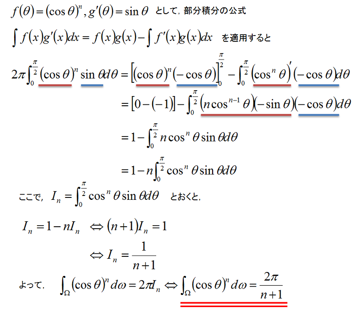 上記を見るとわかるのですが,部分積分を解くと途中で同じ式がまた出てきてしまうので,漸化式を解いています。