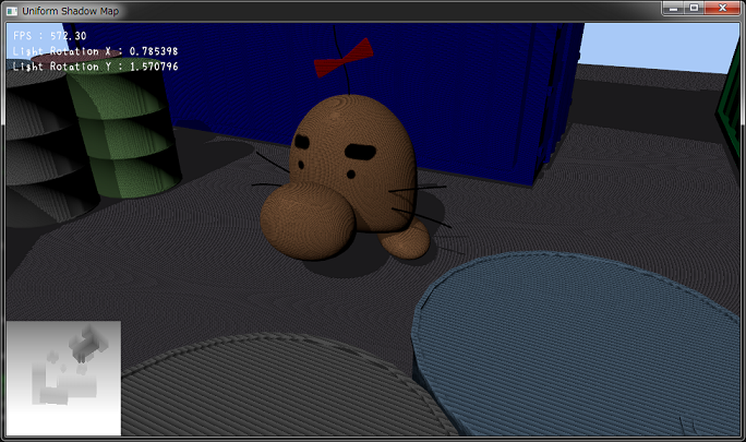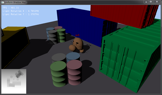 そのために,まずは深度値を格納するシャドウマップを作成する必要があります。これは単純にライト視点でシーンを描画すればよいです。