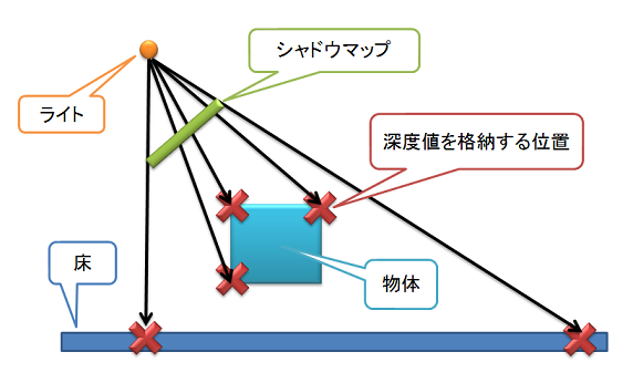 シャドウマップの作成ができたら次は影を描画する処理です。影を描画する方法ですが下図を基に説明します。