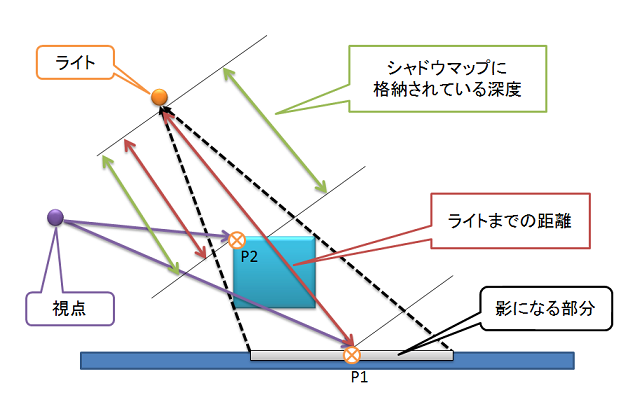 影の描画するやり方ですが,上の図を基に説明します。 まず,紫色の点を視点と仮定します。ある点を描画するときにライトまでの距離とシャドウマップに格納されている深度値を比較します。比較した結果,シャドウマップに格納された深度値よりもライトまでの距離が大きい場合は,影を描画します。小さいあるいは等しい場合は影ではない部分です。 たとえば,点P1の場合は,ライトまでの距離の方がシャドウマップに格納された深度値よりも大きいです。このような場合は影を描画します。 点P2の場合は,ライトまでの距離とシャドウマップに格納された深度が等しくなります。この場合は影は描画されません。 この処理をどうのようにするかということですが,深度値を射影テクスチャリングを使用してオブジェクトにマッピングして比較を行えるようにします。