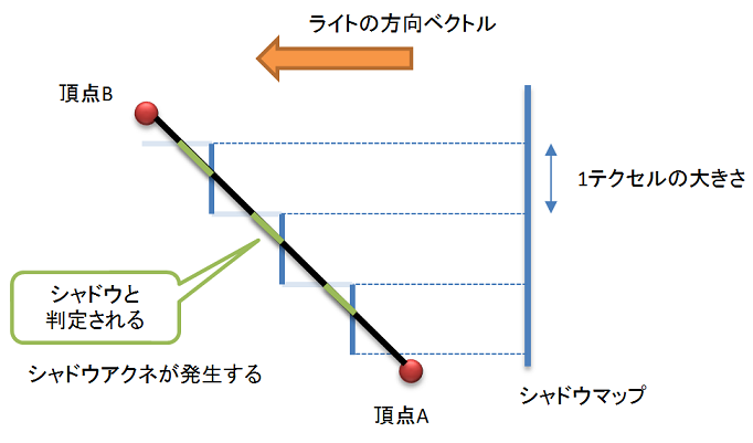 上図のようにシャドウマップに書かれている値よりも,奥にあるものは隠れているということになるので,緑色の部分がシャドウになる部分です。見て分かるように本来はシャドウにならない部分にシャドウが付いてしまいます。緑色の部分だけをみると縞模様になっており,これがシャドウアクネの原因になります。
