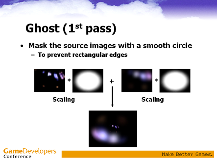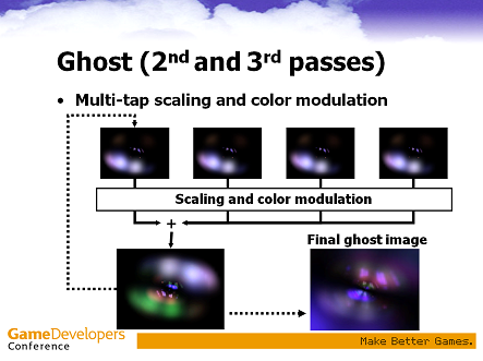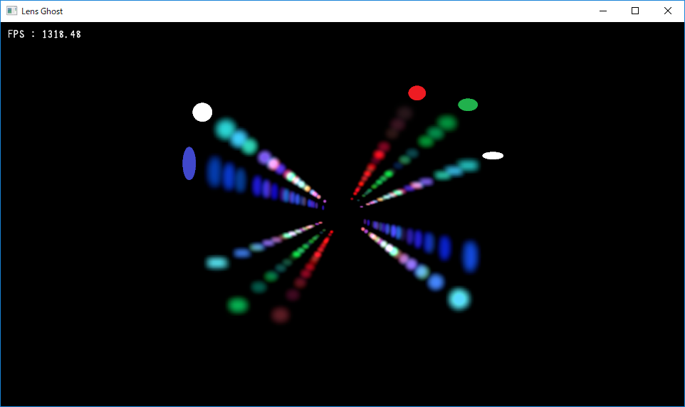 CPU側は入力画像をガウスブラーでぼかして,ゴーストの元になるテクスチャを生成します。あとはこれをゴーストを出したい分だけ書きます。GPUに送るパラメータはRGBに乗算カラー,A成分にテクスチャスケールを格納しています。パラメータは見た目が良い感じになるように調整したもので,とくに根拠はありません。色やゴーストの位置等を調整したい場合は485行目と552行目あたりに書いてあるパラメータをいじってください。